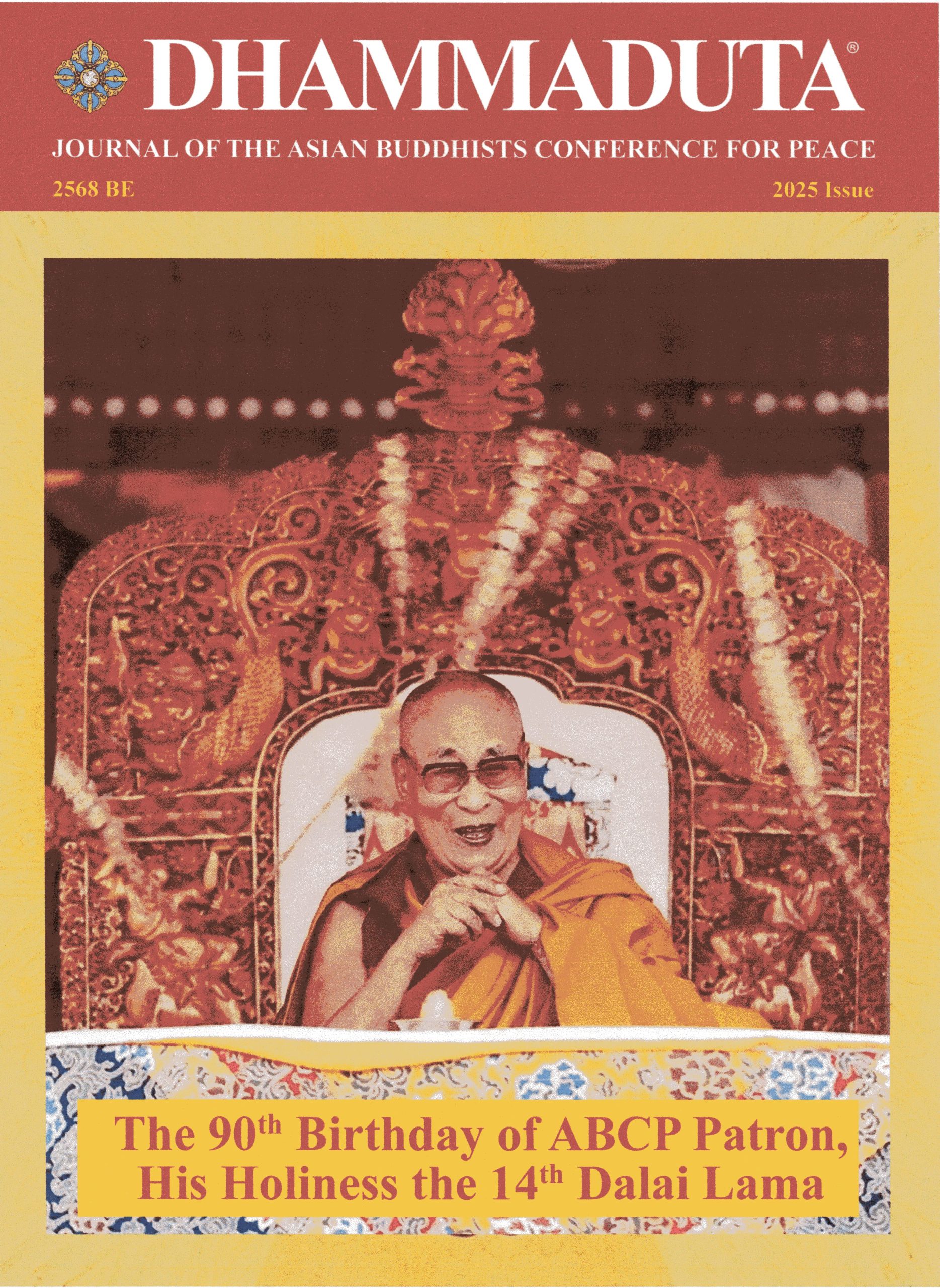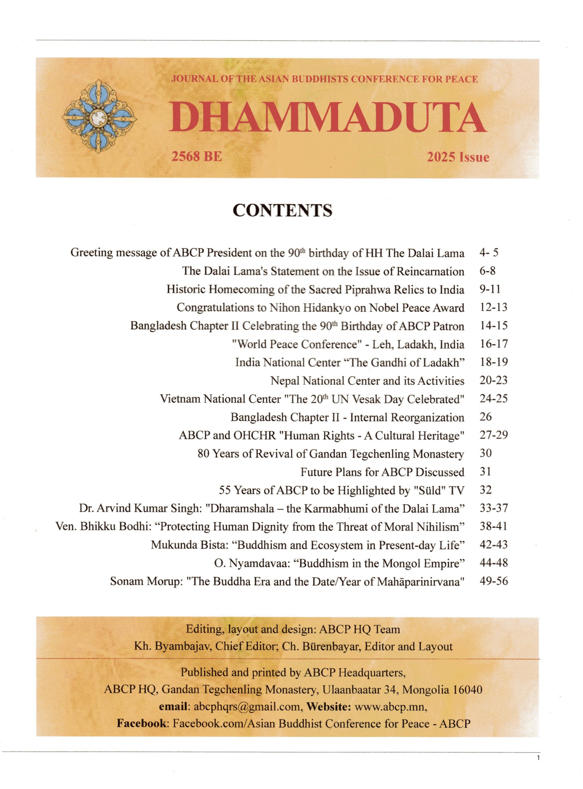 The 2025 issue of the ABCP’s magazine “Dhammaduta” has been released. It highlights the 90th birthday of ABCP Patron, His Holiness the Fourteenth Dalai Lama, HH’s statement on the Issue of Reincarnation. The new issue of the magazine carries interesting articles, such as “The Historic homecoming of the Sacred Piprahwa Relics” to India related to Lord Buddha, “World Peace Conference” held in Leh, Ladakh India as well as an interesting article entitled “Protecting human dignity from the threat of moral nihilism” by Most Ven. Bhikku Bodhi, an eminent Buddhist monk and scholar from the United who is also the President of the Buddhist Association of the United States, and the founder and chair of Buddhist Global Relief. There are also interesting articles by Ambassador O. Nyamdavaa, Mr. Mukunda Bista, Secretary of the Nepal National Center for ABCP and an interesting article on the Date and Year of Mahaparinirvana by an engineer Mr. Sonam Morup. The magazine also highlights activities and stories from ABCP National Centers.