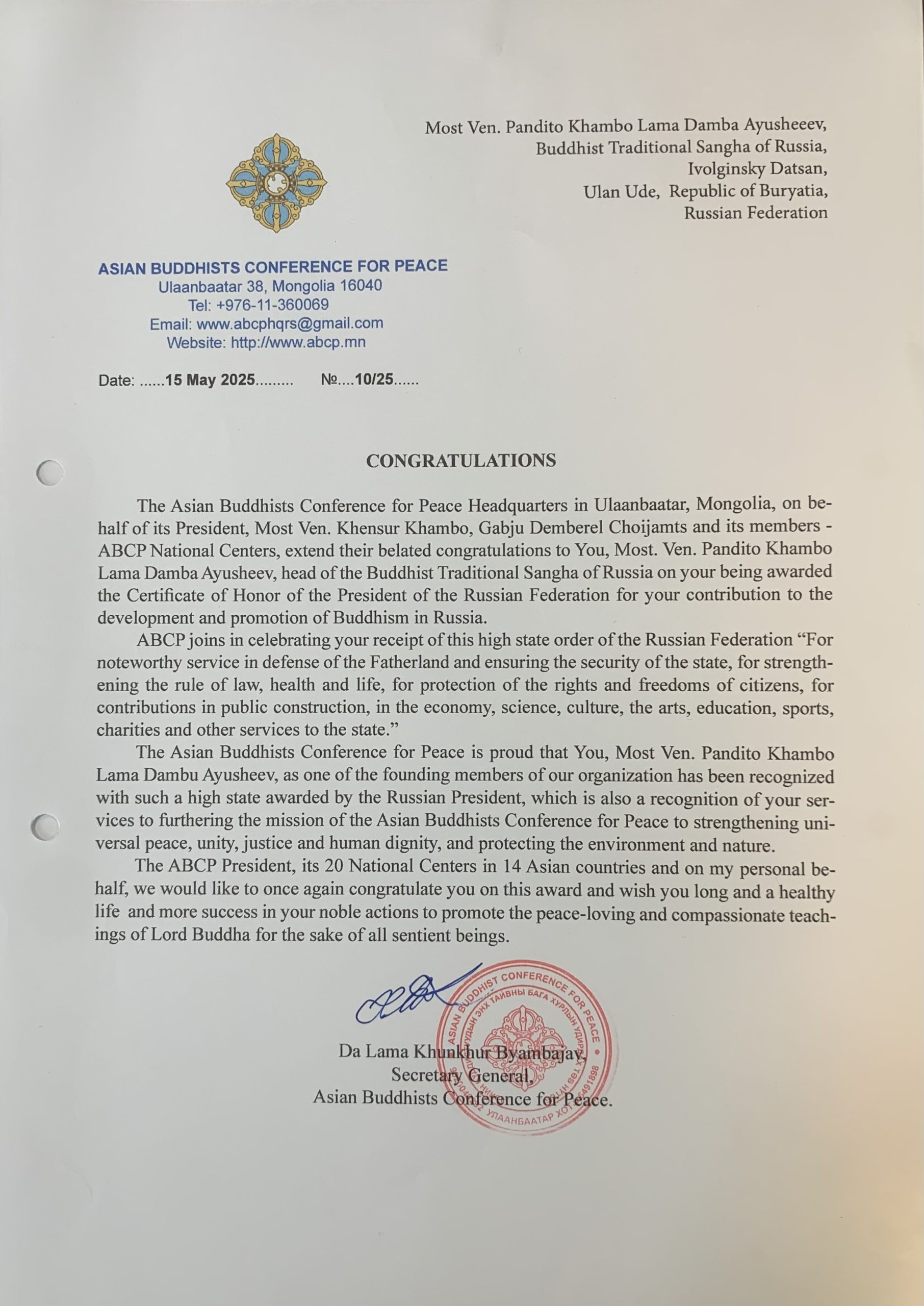 The message further notes “ABCP is proud that You, Most Ven. Pandito Khambo Lama Damba Ayusheev, as one of the founding members of our organization, has been recognized with such a high state award by the Russian President, which is a recognition of your services to furthering the mission of the Asian Buddhists Conference for Peace to strengthening universal peace, unity, justice and human dignity, and protecting the environment and the nature.”