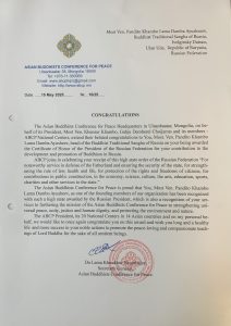 Most Ven. Da Lama Kh. Byambajav, Secretary General ABCP, on behalf of the President of ABCP, Most Ven. Gabju D. Choijamts and on behalf of the ABCP National Centers on 25 May, 2025 sent a message of congratulations the Most Ve. Pandito Khambo Lama Damba Ayusheev, Head of the Traditional Buddhist Sangha of Russia in connection with the award Pandito Damba Ayusheev received from the President of the Russian Federation – “The Certificate of Honor of the Russian Federation.”
