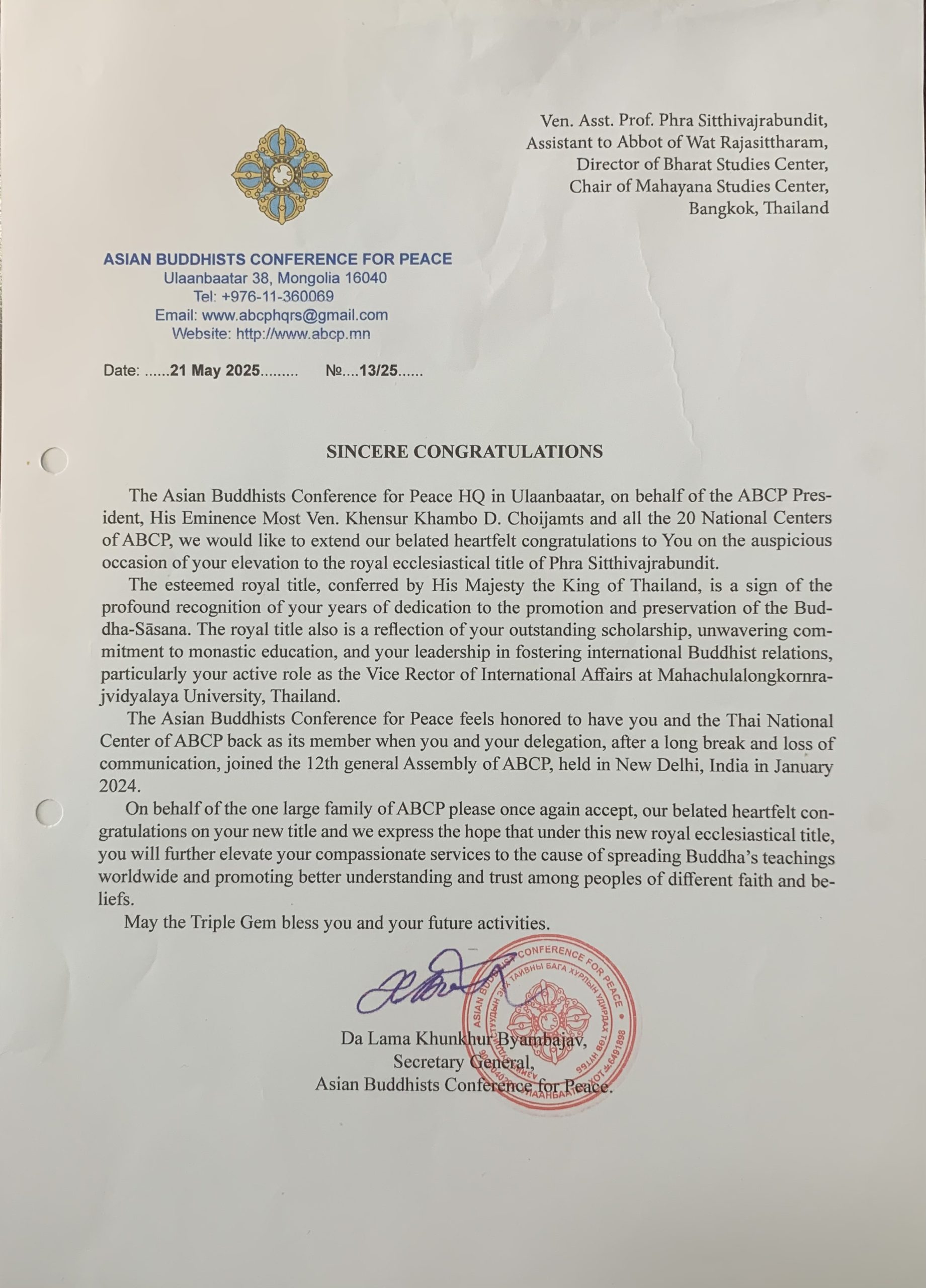 In this connection, on 25 May 2025, Most Ven. Da Lama Kh. Byambajav, Secretary General of ABCP, on behalf of the ABCP President and its National Centers congratulated Most Ven. Phra Sitthivajrabundit on the auspicious occasion of his elevation to the royal ecclesiastical tile of Phra Sitthivajrabundit and wished him more success in his compassionate services to the cause of spreading Buddha’s teachings worldwide and promoting better understanding and trust among peoples of different faith and beliefs.