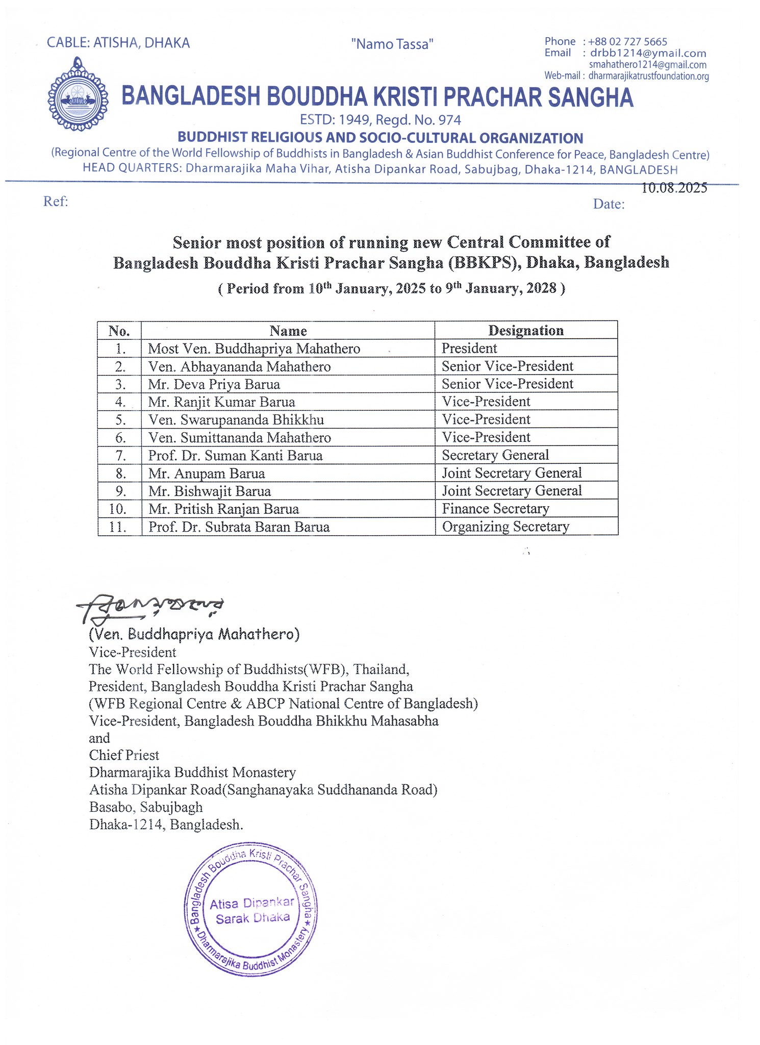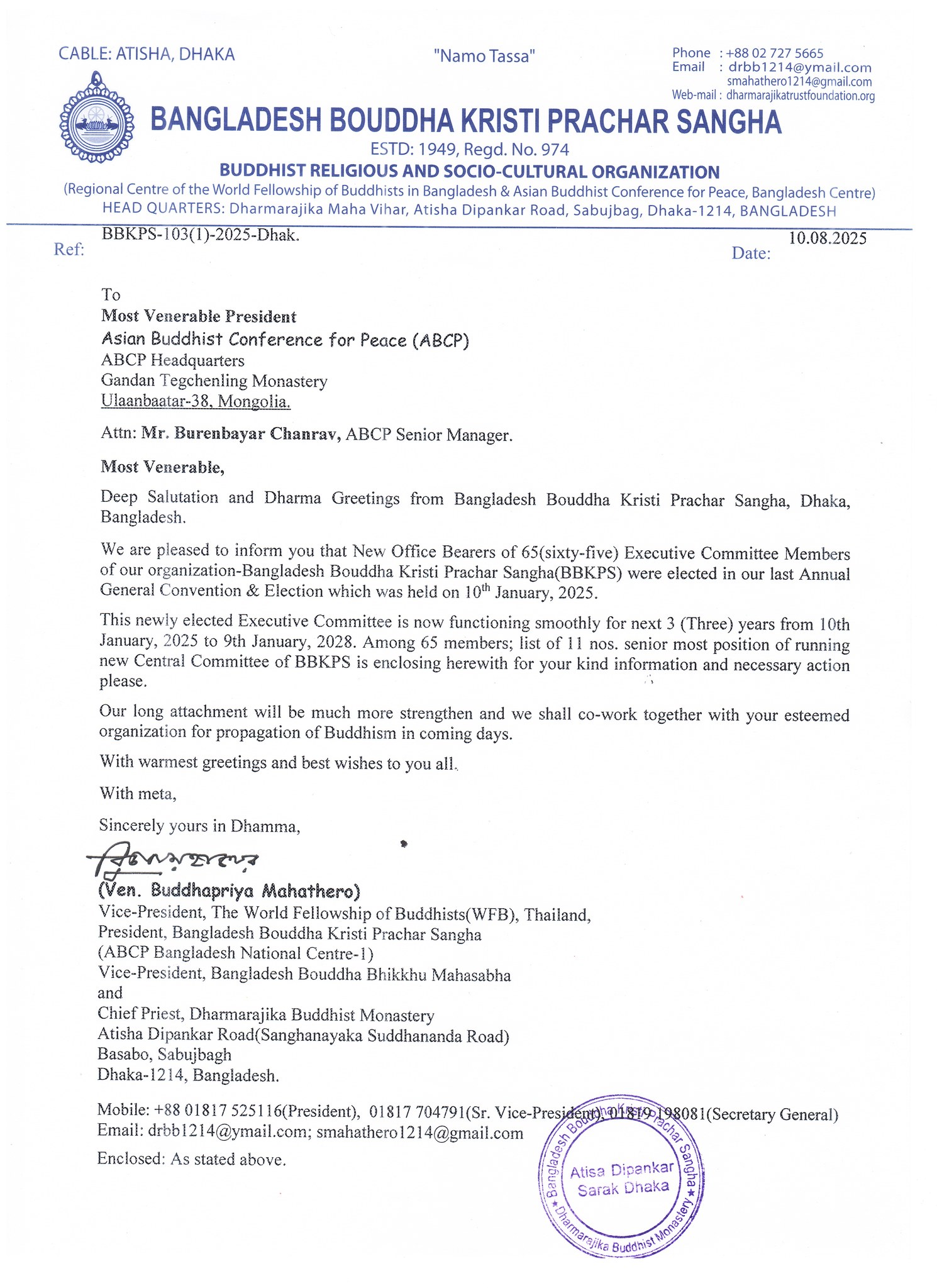 Bangladesh Bouddha Kristi Prachar Sangha (BBKPS), the National Center One of ABCP in Bangladesh has informed that New 65 (sixty-five) Office Bearers or the Members of the Executive Committee of the organization- Bangladesh Bouddha Kristi Prachar Sangha were elected at the Sangha’s last Annual General Convention and Election, which were held on 10 January, 2025. The new members of the Executive Committee have been elected for three years. This was informed by Ven. Buddhapriya Mahathero, Vice-President of the World Fellowship of Buddhists (WFB), Thailand, and President of the Bangladesh Bouddha Kristi Prachar Sangha – National Center One.