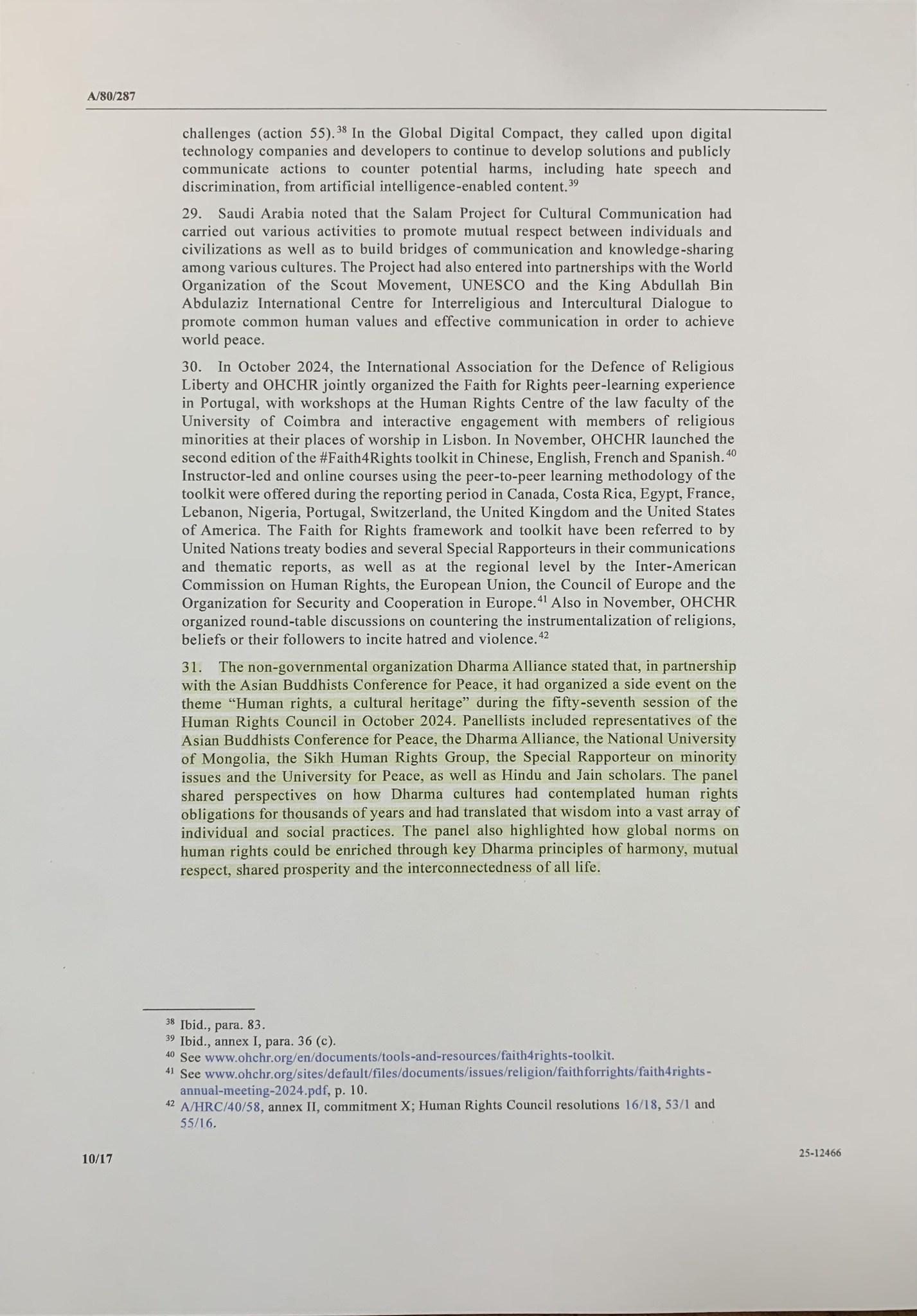 In this report of the Eightieth session, Item 72 (b) of the provisional agenda A/80/150 “Promotion and protection of human rights: human rights questions, including alternative approaches for improving the effective enjoyment of human rights and fundamental freedoms” on page 10, item 31, mentions about the side event organized jointly by ABCP HQ and Dharma Alliance. The report, in this connection, notes: “The non-governmental organization Dharma Alliance stated that, in partnership with the Asian Buddhists Conference for Peace, it had organized a side event on the theme “Human rights, a cultural heritage” during the fifty-seventh session of the Human Rights Council in October 2024. Panelists included representatives of the Asian Buddhists Conference for Peace, the Dharma Alliance, the National University of Mongolia, the Sikh Human Rights Group, the Special Rapporteur on minority issues and the University for Peace, as well as Hindu and Jain scholars. The panel shared perspectives on how Dharma cultures had contemplated human rights obligations for thousands of years and had translated that wisdom into a vast array of individual and social practices. The panel also highlighted how global norms on human rights could be enriched through key Dharma principles of harmony, mutual respect, shared prosperity and the interconnectedness of all life.”